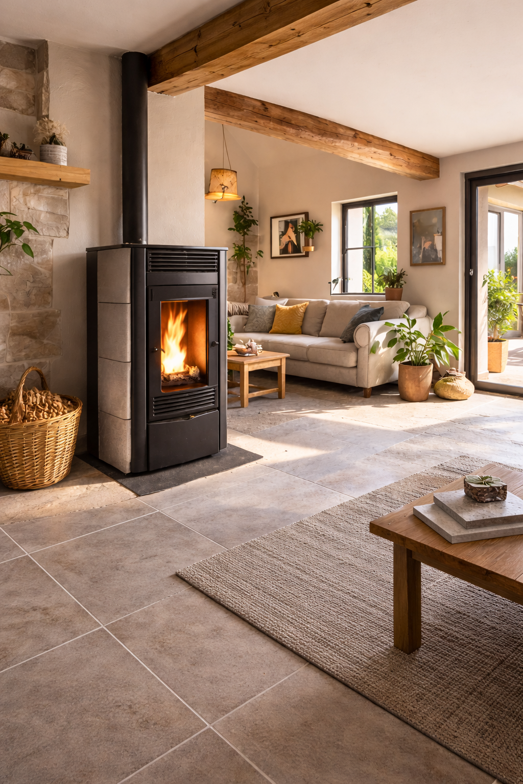 Poêle à granulés installé dans une maison proche de Lambesc pour un chauffage performant et économique.