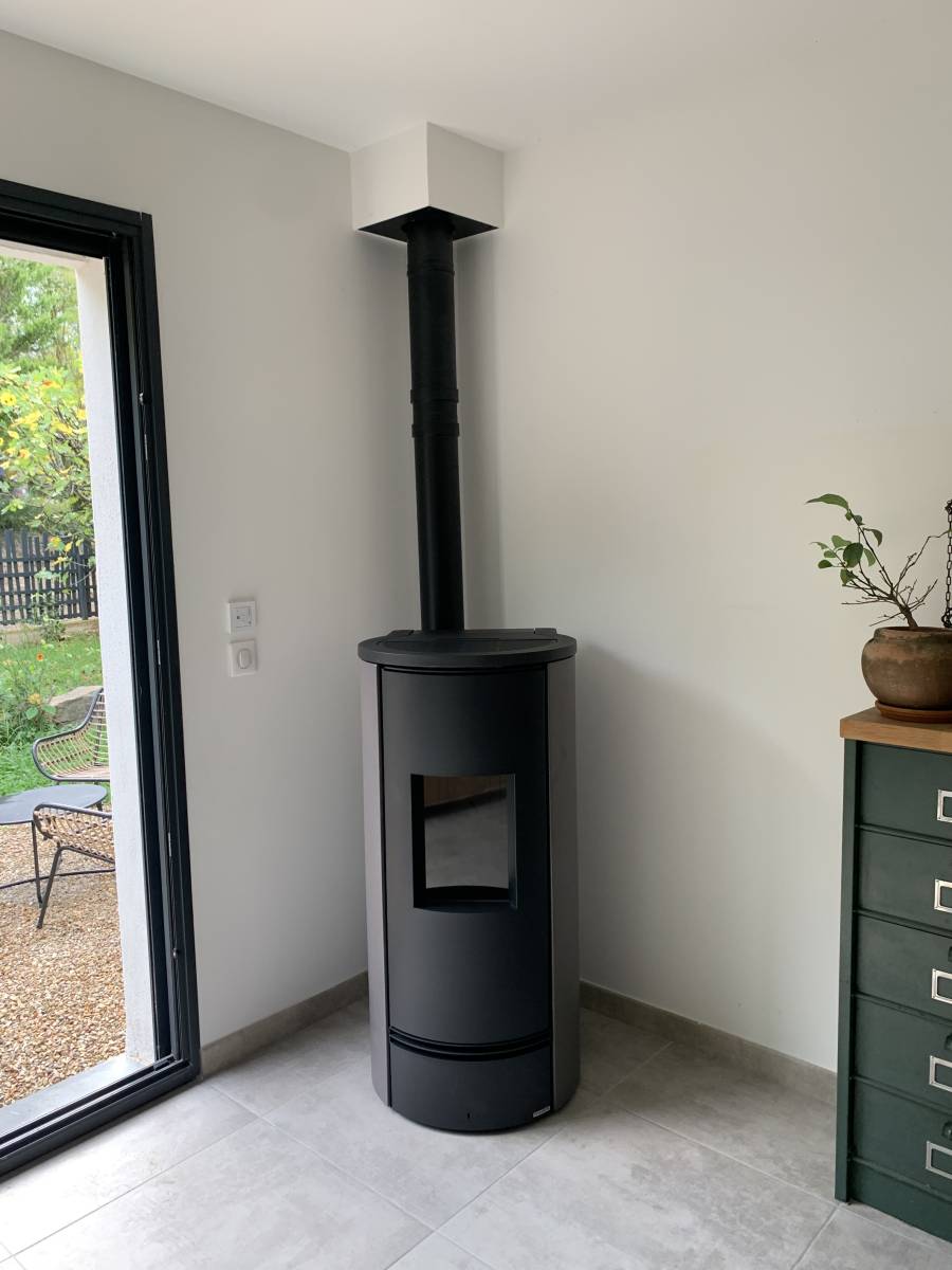 Installation d’un poêle à granulés réalisée par Le Plaisir de la Flamme dans une maison individuelle proche de Villelaure.